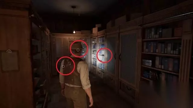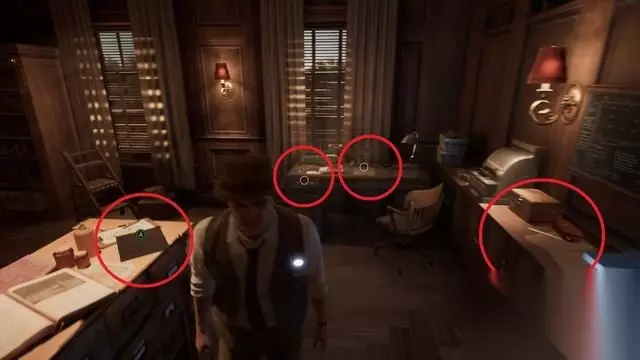 房间内的红圈处都是文档,拉开抽屉还能拿到收集品和房间钥匙。