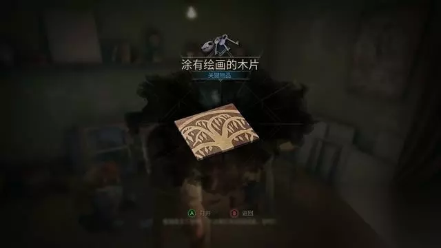 桌上拿到“绘画木片”后,在房间内找到小盒子开始解谜。