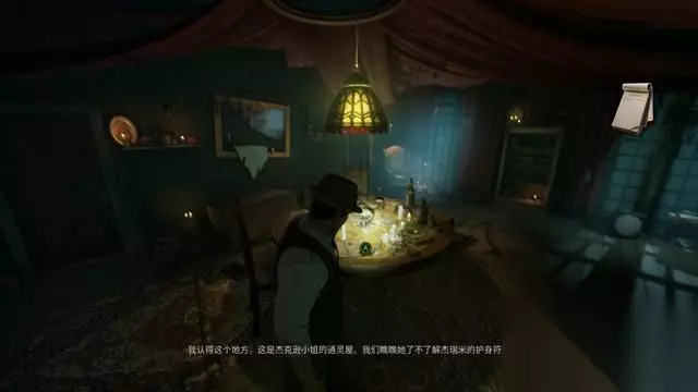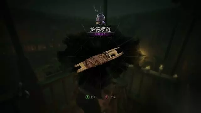 在二楼使用钥匙开门,进入房间后在桌上拿到护符。