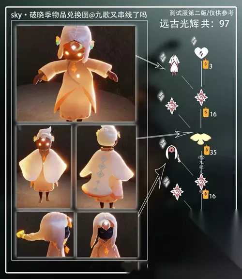 光遇远古光环书虫兑换图 一、远古光环书虫先祖兑换图 1、白色长袍,兑换需要16根黄蜡烛。 2、长遥鲲斗篷:兑换需要35根黄蜡烛。 3、神奇女侠发型:兑换需要16根黄蜡烛。 4、一张乐谱:兑换需要27根黄蜡烛。 5、兑换总计:需要97根黄蜡烛。