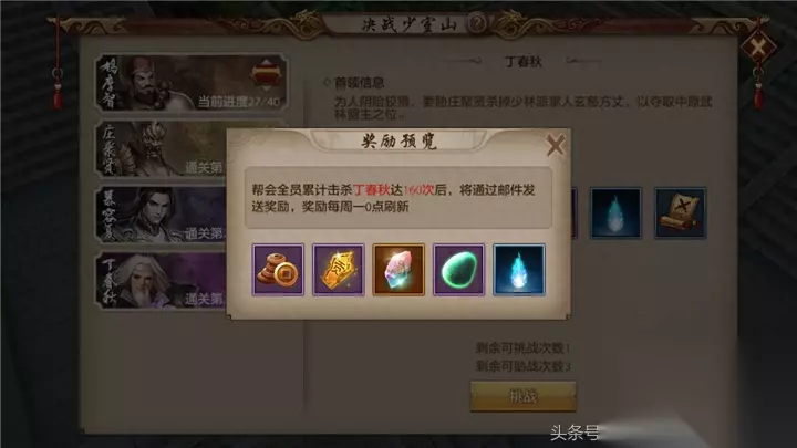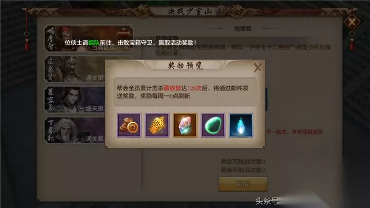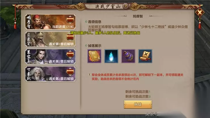 第二个技能是三入地狱,当鸠摩智血量很少的时候,便会释放三入地狱,此技能会在少侠脚下放出火圈,这是考验走位与DPS的时刻,如果打得慢,三入地狱会让整个地图火圈满地! 击杀鸠摩智之后即完成副本,成功通关。 【帮会集体奖励】 通关决战少室山副本可以获得武魂打造等相关道具,当帮会成员通关某章次数达到一定次数时,即可获取额外的全帮会奖励,奖励通过邮件发放,每周一0点重置奖励。
