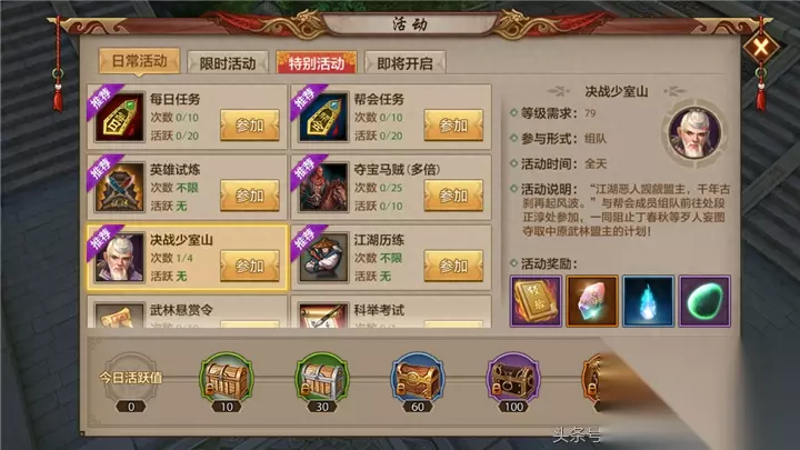 决战少室山副本是帮会副本,也就是说必须加入帮会才可以参加活动,决战少室山副本掉落武魂升星、凝魂等武魂打造相关道具,可以说是每天都必须参加的副本活动。