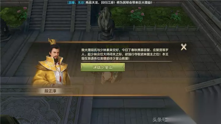【决战少室山】 等级要求:79级 参与形式:组队(最少3人,最多5人,且必须加入帮会,NPC在帮会领地之中) 活动时间:全天 活动介绍:江湖恶人觊觎武林盟主之位,千年古刹再起风波!帮会的兄弟姐妹们,快来阻止丁春秋等歹人妄图夺取中原武林盟主之位的计划吧! 【活动简介】 首先,少侠必须加入了帮会且等级达到79级,即可组队参与决战少室山活动,来到帮会领地,与段正淳对话(103.128)即可进入副本。