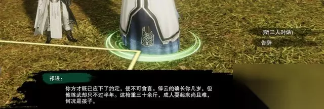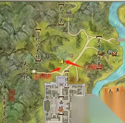 7 、在太原城外北侧位置找到【杨天】,他觉得侠士是想拐走杨宁后人的人贩子,向前方走几步,幸好祁进道长及时赶到,误会得以开释。 8 、祁进道长的剧情结束之后,不要急着返回城内,再次与【祁进】对话。