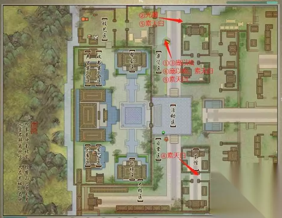 2 、站在光圈里等待剧情,然后去墙角寻找新的光圈,发现小毛丝鼠偷饼的真相。 3 、回去与【庞以松】对话,他让侠士寻找道长素天白。 4 、在太原茶馆门口位置,茶馆小二【赵茶】身旁,可找到NPC【素天白】。 5 、回到刚刚找到光圈的墙角位置寻找【杨天】,但只有道长在此,下一步要和道长一同找庞以松问问那人的去处。 6 、回到【庞以松】的位置,和二人轮流对话,决定分头出城寻找杨天。