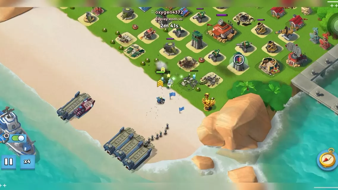 这是《海岛奇兵》的一局战斗,玩家进攻螃蟹第66阶段时,策略布置得不错,但因仅立了四座伤害雕,鸭子伤害不足,未能成功攻下该阶段,玩家盼着瓜爷回归提升战力。