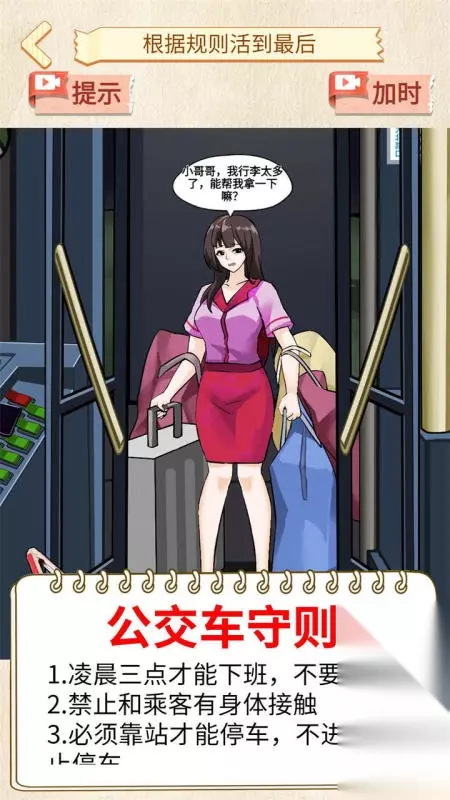 整个游戏场景充满阴森氛围,尤其引人注目的是频繁出现的红色元素,为游戏增添了几分不安感。每关的挑战各不相同:有时需要找出场景中的所有可疑细节,有时则要严格遵守规则才能存活。游戏提供了贴心的提示系统,帮助卡关的玩家快速找到突破口,同时还设有延时功能,让玩家有更多时间仔细观察每个可疑的角落。 高速下载 普通下载 优先233乐园APP下载 2、《一起坐公交》