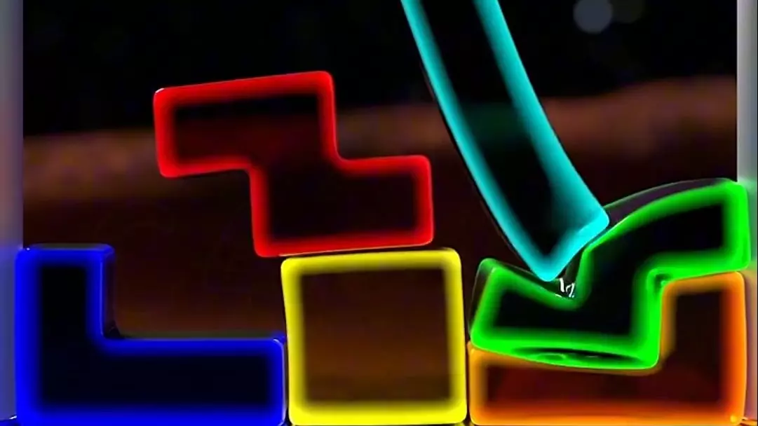 这是渲云动画系列创作的叠叠乐3D动画,将经典俄罗斯方块方块设计为大理石霓虹质感,演示了方块堆叠下落的趣味动态效果,视觉创意独特,风格酷炫