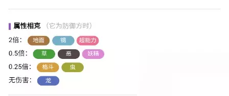 相克属性 2倍:地面、钢、超能力 0.5倍:恶、草、妖精 0.25倍:格斗、虫 无伤害:龙