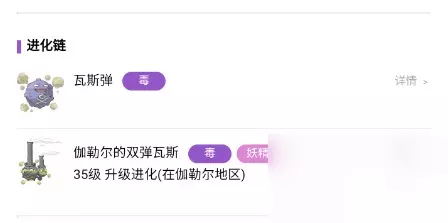 相关推荐:宝可梦朱紫零之秘宝角色大全 宝可梦朱紫伽勒尔的双弹瓦斯进化条件 属性:毒、妖精(毒气宝可梦) 身高:1.2m 体重:9.5kg 进化链:瓦斯弹→伽勒尔的双弹瓦斯 伽勒尔的双弹瓦斯:35级升级进化(伽勒尔地区)