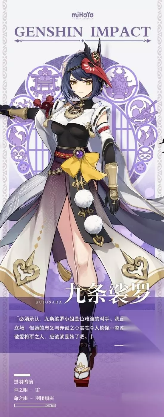 t15_2-t15_1:9.0 标签: 娑罗 原神九条娑罗是雷电将军闺下最忠实的手下,同属于雷系角色,今天小辰给大家带来原神九条娑罗角色介绍,一起来了解一下吧!