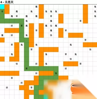 无思天,出口左上 boss数据如下: 妖王:生命994500;攻击99000 鬼王:生命994500;攻击108900 无思天地图特产:清灵草 进图时我们在下方中间位置 → 往左走2格 → 往上走2格 → 往右走1格 → 往上走2格 → 往右走3格 → 往上走2格 → 往左走6格 → 往上走6格 → 往左走1格 → 往上走4格 → 往左走4格 → 往上走2格碰到只守关boss,击杀后往上走即可通关。