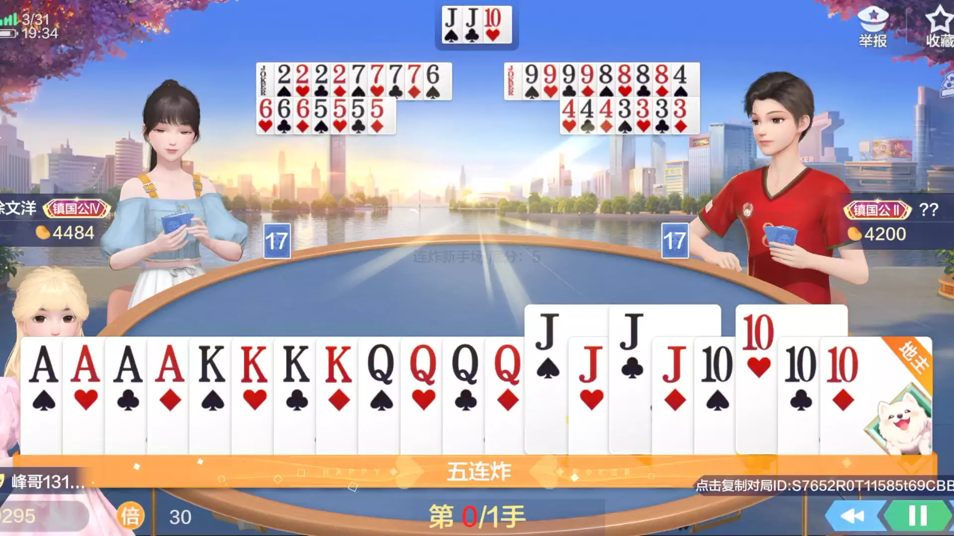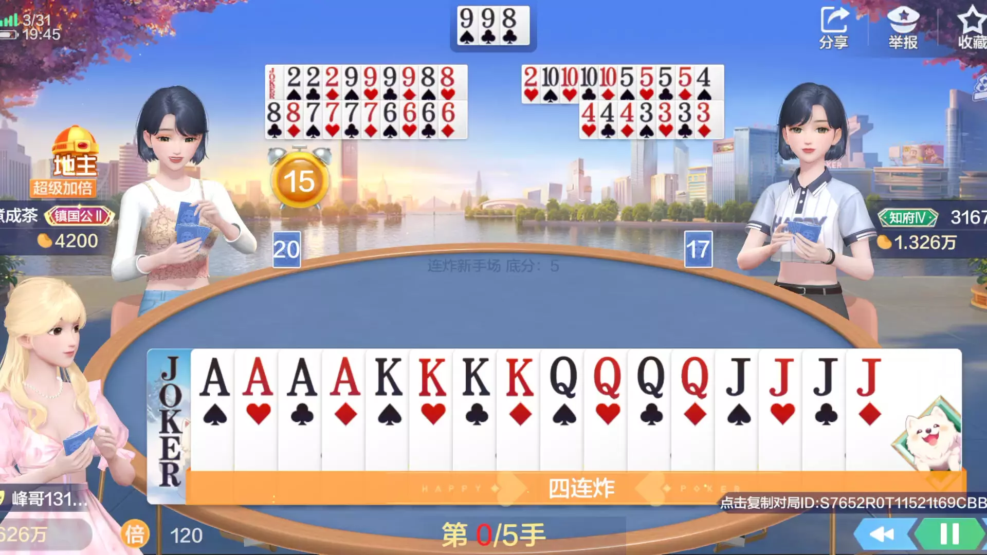 这是欢乐斗地主的对局分享,地主通过天命技能将手牌2变换为K,凑出KKKK炸牌,随后打出飞机牌型,其他玩家均表示要不起,这手飞机牌型十分强势。
