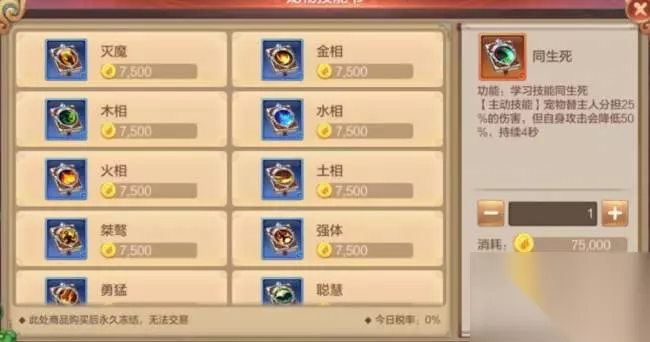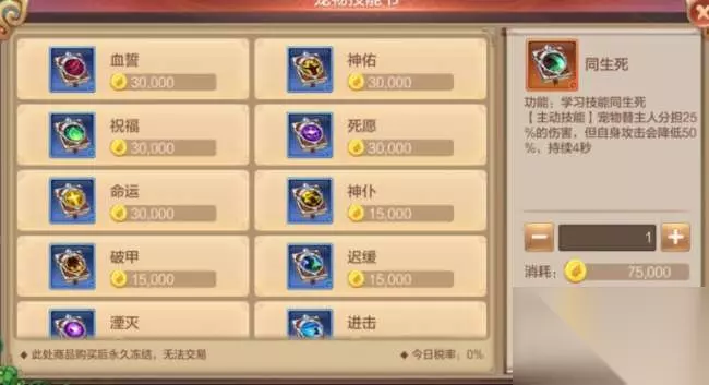 宠物一般可以分为攻击类(物攻/魔攻),抗伤类。物攻宠物必学的技能:野蛮(宠物物理攻击提升7.5%),强大的物攻性宠物搭配野蛮让战斗力提升一个台阶。魔攻宠物必学技能:毁灭(宠物魔法攻击提升7.5%),与物攻类似,也是提升战斗力。血宠必学技能:固元(生命上限提升7.5%),宠物血量增加,为主人承担更多的伤害!神仆(主人生命上限提升5%,但是宠物伤害下降8%),增加主人血量,但不适合攻击类宠物携带