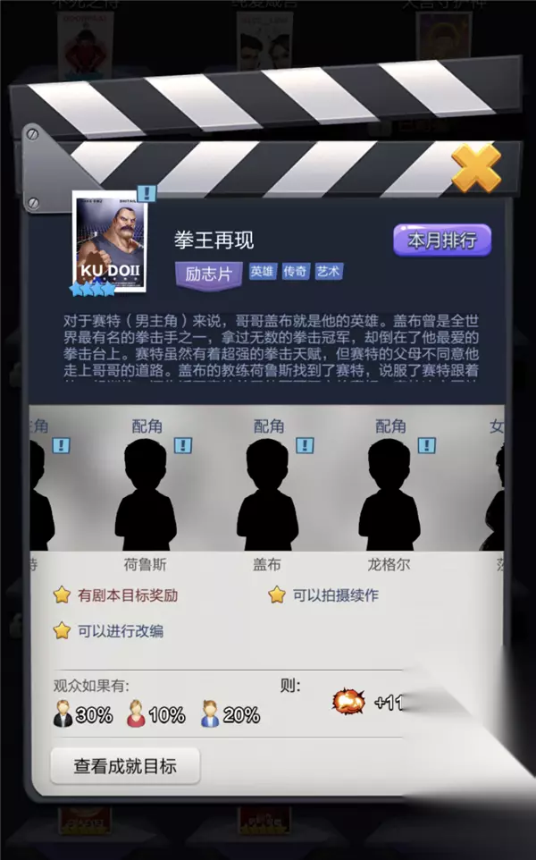 影片类型为科幻片,有Lee的玩家优先兑换获取,不仅满足Lee套艺人的一切限制条件,作为科幻片剧本,更是能够激活“老头子” 精益求精技能,使得总票房获得5%的额外加成。 剧本《超级女英雄》对应人物(普通非R或小R玩家)上阵详解: 1. 格瑞丝 限制条件:演技派女艺人 所需属性:表演、艺术 推荐艺人:娇红贞(限时猎聘)/小龙儿(限时猎聘) 2.杰克森 限制条件:欧美籍男艺人 所需属性:场面、剧情 推荐艺人:哈雷(指导片拍摄)/小李子(限时活动积分兑换)/特工008(明星派对) 3. 迈威尔 无限制条件 所需属性:场面、娱乐 推荐艺人:杨无奇(限时猎聘)/实锤女士·未来版(大冒险转盘)/阿汤哥(大冒险转盘) 4. 丽兹 限制条件:青春型偶像派艺人 所需属性:表演、剧情 推荐艺人:田原阿丽莎(集团商店)/马驹(大月卡) 5. 加斯顿 限制条件:欧美成熟型艺人 所需属性:场面、表演 推荐艺人:威鲁斯(大冒险转盘)/小李子(限时活动积分兑换) 推荐组合::1.娇红贞 2.哈雷 3.杨无奇 4.田原阿丽莎 5.小李子 剧本推荐度:★★★★★(有lee的玩家)/★★★☆ 剧本推荐拍摄类型:动作/动画 2.《拳王再现》