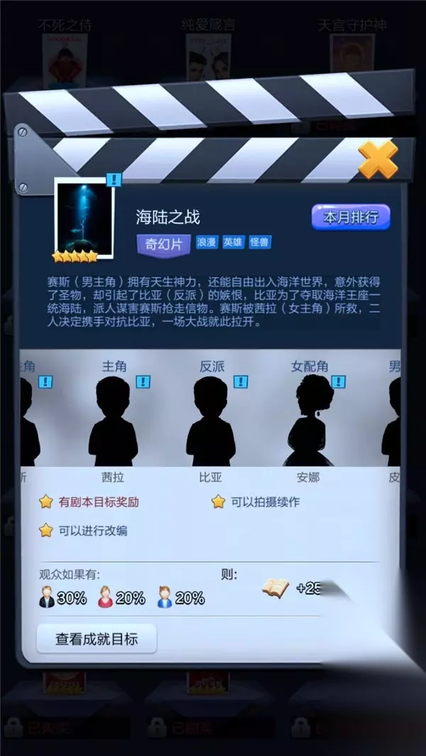 影片类型为励志片,双十一/双十二狂欢节活动均可以选择用活动积分兑换的剧本,非常的亲民化。 剧本《拳王再现》对应人物(普通非R或小R玩家)上阵详解: 1. 赛特 限制条件:青春型男艺人 所需属性:场面、剧情 推荐艺人:哈雷(指导片拍摄)/马驹(大月卡)/杨无奇(限时猎聘) 2. 荷鲁斯 限制条件:欧美演技派艺人 所需属性:表演、娱乐 推荐艺人:小李子(限时活动积分兑换)/阿汤哥(大冒险转盘) 3. 盖布 无限制条件 所需属性:场面、剧情 推荐艺人:实锤女士·未来版(大冒险转盘)/芳幽梅(大月卡) 4. 龙格尔 限制条件:欧美成熟型艺人 所需属性:场面、表演 推荐艺人:小李子(限时活动积分兑换)/特工008(明星派对) 5. 莎娜 限制条件:演技派成熟型女艺人 所需属性:表演、艺术 推荐艺人:娇红贞(限时猎聘) 推荐组合::1.哈雷 2.小李子 3.杨无奇/实锤女士·未来版 4.特工008 5.娇红贞 剧本推荐度:★★☆ 剧本推荐拍摄类型:叙事/动作 3.《海陆之战》