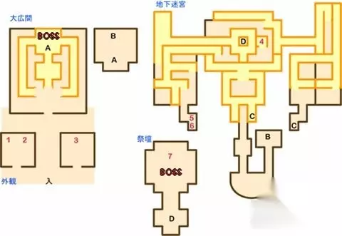 攻略提示: 入→BOSS1→A→D→E→F→BOSS2 宝箱: 1:すごろく券 2:ドレイの服(需要最後の鍵) 3:天空の鎧(需要最後の鍵) 4:悪魔の爪 5:破滅の盾 6:奴隷の服 7:命のリング(BOSS2战后)
