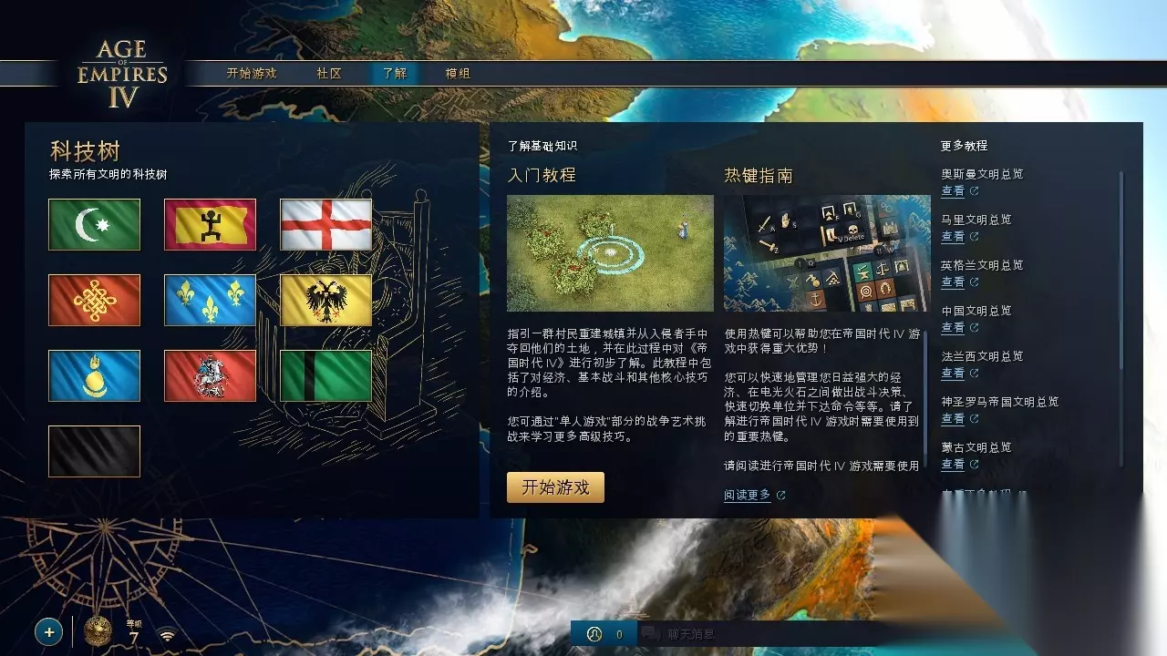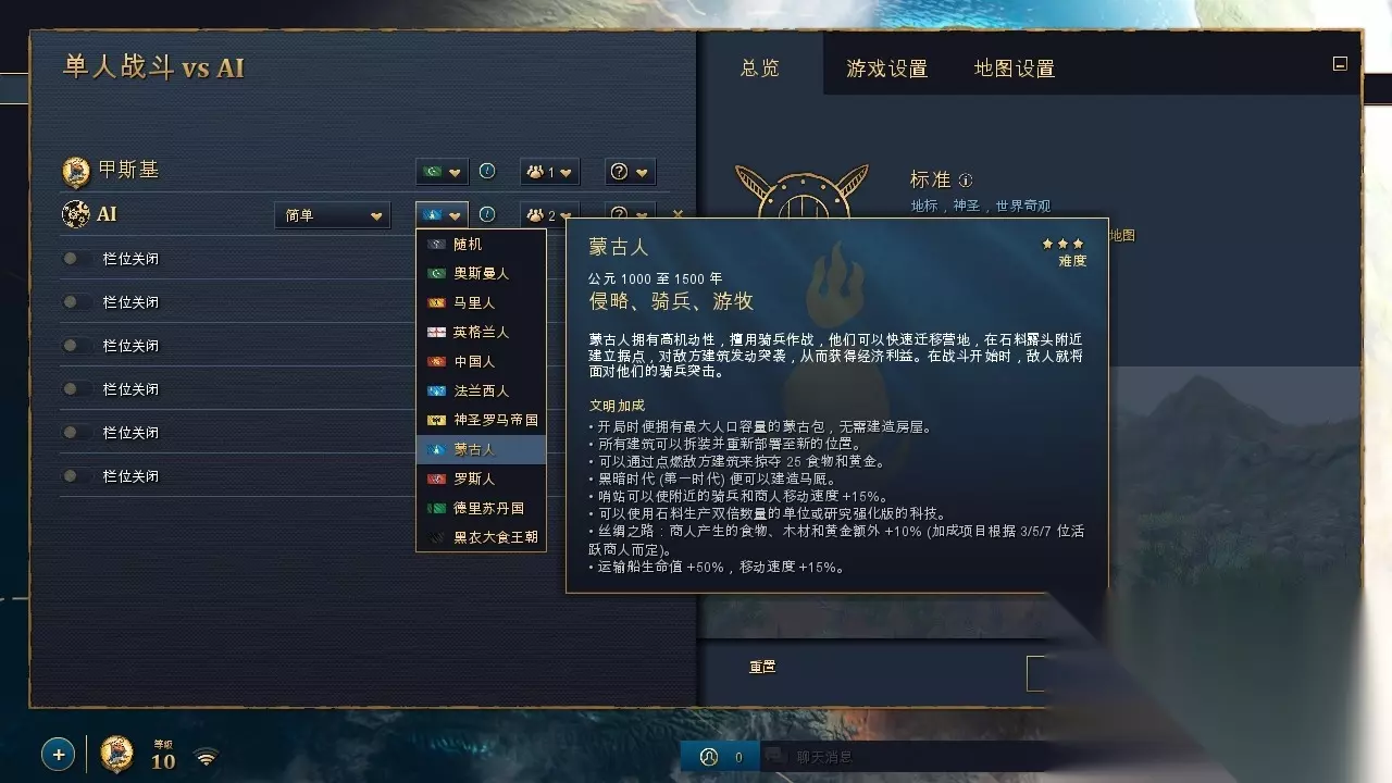 《帝国时代4》中的文明(民族国家)数量目前已经达到了10个——中国、英格兰、法兰西、神圣罗马帝国、蒙古、罗斯、德里苏丹、黑衣大食、奥斯曼、马里,其中奥斯曼和马里正是在“25周年庆”更新才刚刚加入到《帝国时代4》的。为了让玩家快速熟悉这两个文明,战争艺术模式里新加了这两个文明的专属任务关卡,相当于迷你版的战役剧情,帮助玩家快速上手。