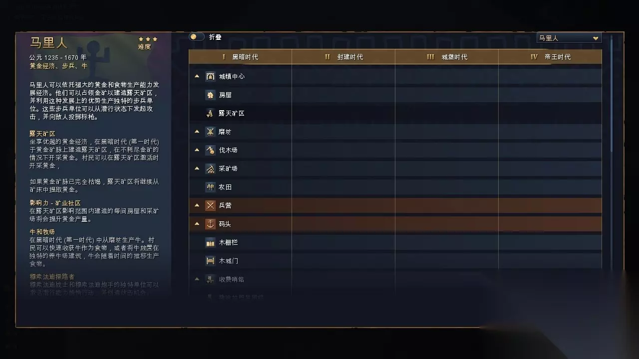 不同的文明各有所长,它们拥有各自不同的科技树,以及专属的兵种和科技。比如非常适合新手的法兰西,以简单粗暴的骑兵为长处,不仅拥有法兰西专属的骑兵兵种和配套科技,连升级时代的地标也有和骑兵相关的,就连法兰西的成就里也有一个“不使用步兵获得一场胜利”,可见文明的特色和区分度在《帝国时代4》里占据非常重要的地位。 新加入的奥斯曼文明就拥有一个独一无二的“维齐尔点数”系统,用于在帝国议会里解锁一些强大的加成buff或者立刻获得一些高价值的物资和人员支援。而奥斯曼的独有建筑物军事院校,则能在不消耗任何资源的情况下持续性地训练一些比较基础的士兵兵种,还能通过大学和铁匠铺的光环效果加快训练速度,简直是打消耗战的神器。而马里作为另一个新加入的文明,开发团队将历史上马里帝国盛产黄金的特质通过露天矿区这种专属资源建筑的形式来体现,黄金资源上更有优势。不过,新加入的两个文明操作门槛都比较高,各自特性的掌握和理解也需要玩家通过实战来消化。