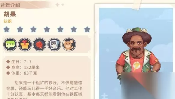 胡果是一位粗犷的铁匠,不仅能锻造金属,还能演奏好音乐。他对待工作非常认真,基本上每天都能看到他在铁匠铺里干活。