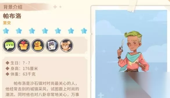 巴勃罗是砂石镇最关心时尚的人。他经常去其他城镇收集款式并试图跟上时尚潮流。同时,他也非常关心八卦,什么都知道。他总是第一个知道任何事情。