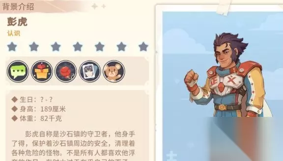 彭虎自称是沙市镇的守护者。他非常擅长保护沙市镇周围的安全,清理各种危险的怪物。并不是每个人都喜欢他夸张的风格。有时候他太在意自己的面子,会说一些无厘头的话。