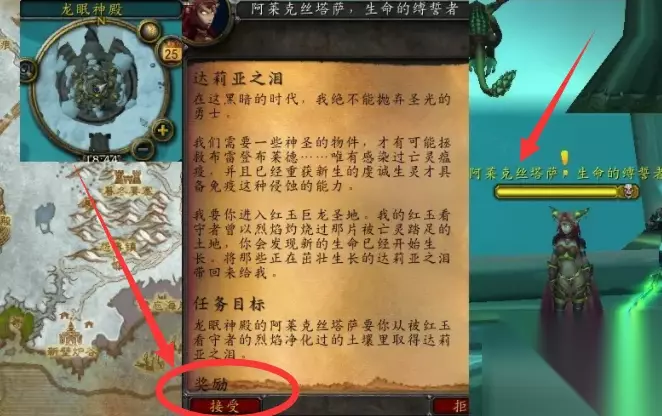 任务完整步骤: 1、进入魔兽世界游戏,找到龙眠神殿的任务NPC:阿莱克丝塔萨,生命的缚誓者接受【达莉亚之泪】任务。