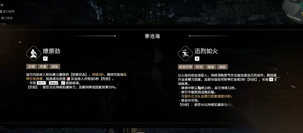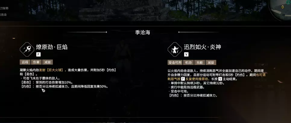 火男季沧海的玩法核心在于技能组合、怒气管理与实战操作。他的技能选择直接决定了战斗风格,F技能燎原劲的三个分支各有侧重,F1适用于单排或双排,能在格挡成功后立刻反击夺回先手。F2则更适合应对多人集火或武田、妖刀姬等英雄的大招,能打断对手蓄力攻击并提供脱离机会。F3巨焰是释放火球进行远程消耗和击飞的主流选择,尤其在开启大招后可以无限释放。大招V1迅烈如火允许在受击时使用,提供稳定的疾行与精力恢复,即使脱离战场怒气损耗也较小。而大招V3狂战则大幅提升攻击力与攻击速度,并通过造成伤害回复怒气,适合追求高爆发输出的玩家,但对操作要求更高。