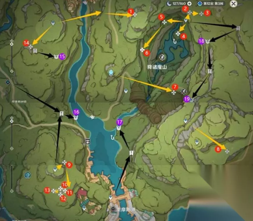 2、须弥地区遗落的能量块收集位置参考下图所示,可以对照箭头的方向前往对应的位置进行收集。