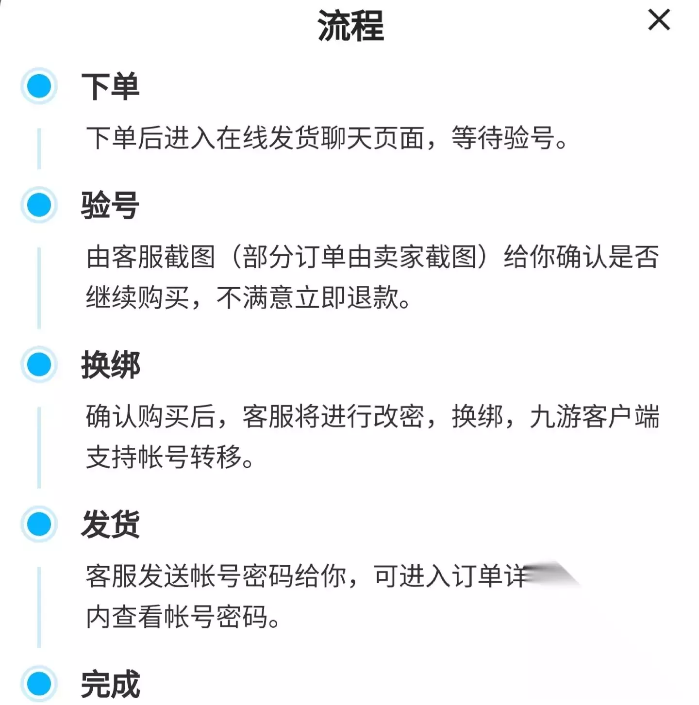 账号交易公开透明 面对买卖双方的交易,官方不会撒手放荡不管,而是根据买家的选择委派专业的客服进行指导,三重验号服务全部都是免费,改密换绑只需要买卖双方微微动动手,整个交易就会立马完成,而且在交易完成之后客服与买卖家的聊天记录将会一直保留,以便后续发生纠纷来当做证据。