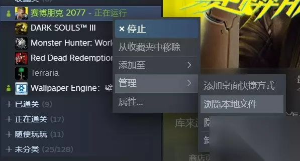 点击阅读:2077赛博朋克攻略大全>>> 2077赛博朋克不能保存怎么办? 第一步: 右键steam2077,浏览本地文件;
