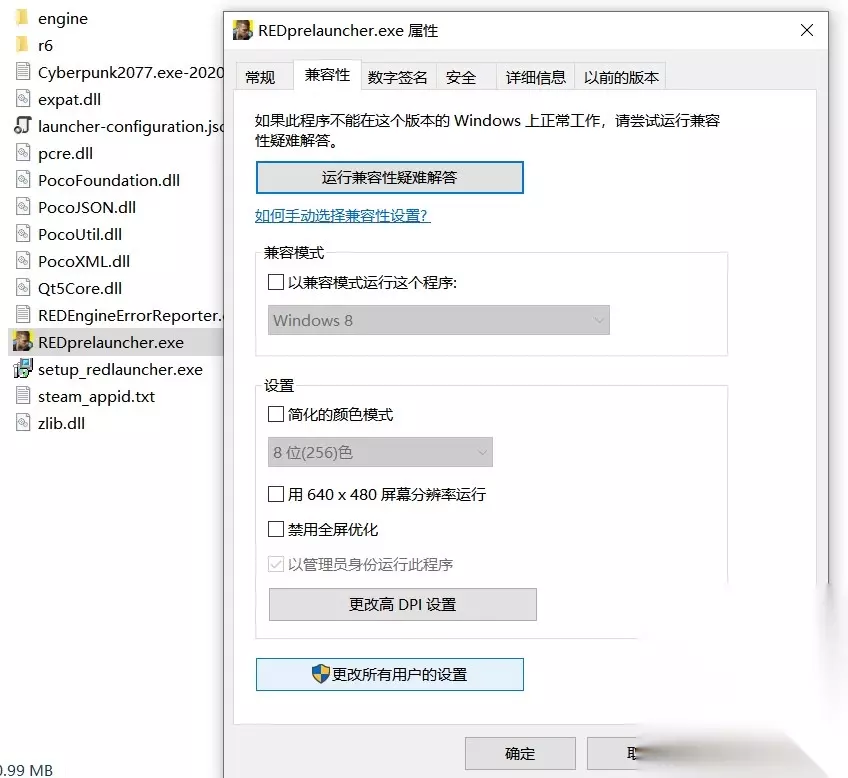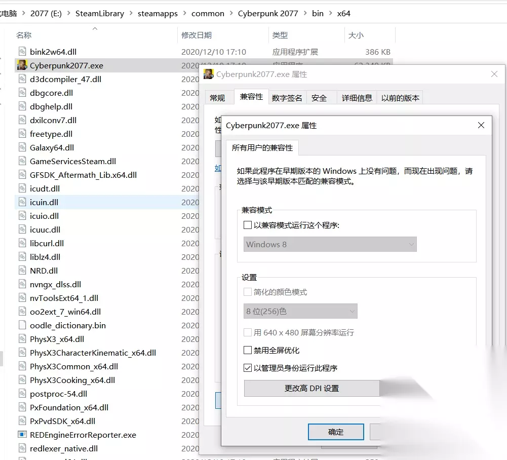 第四步: 去bin文件夹,找到Cyberpunk2077,还是右键属性,作为管理员运行。