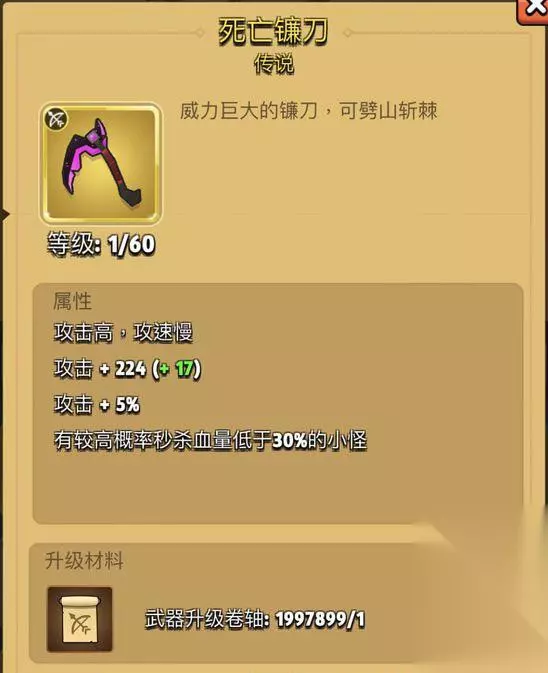 死亡镰刀 介绍 威力巨大的镰刀,可劈山斩棘 属性 攻击高,攻速满 攻击+224(+17) 攻击+5% 有较高概率秒杀血量低于30%的小怪 升级材料 武器升级卷轴:1997899/1