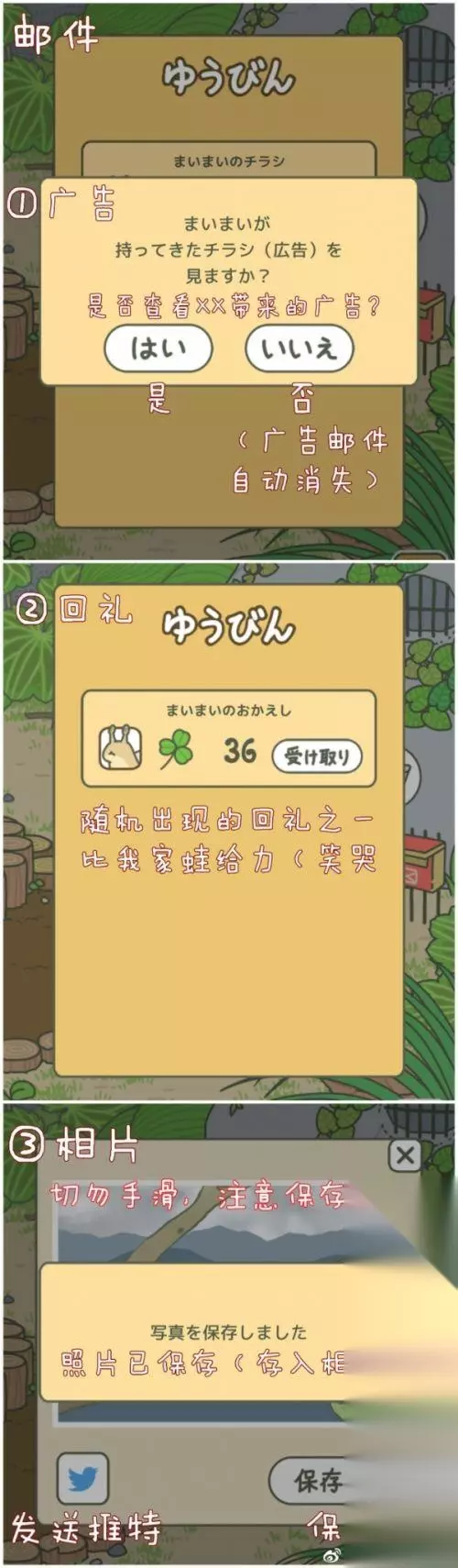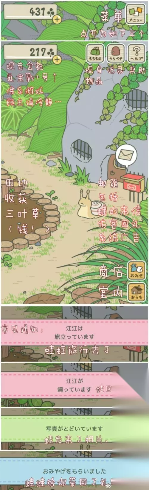 旅行青蛙中文翻译: 请参照图片使用。以下文字说明: 1、界面分为庭院和室内。 2、庭院内上方为【主菜单】,包括【现有物品】、【记录】、【帮助】三个子菜单。 3、庭院内的田地,随时间长出三叶草[青蛙旅行三叶草多久可以长出来?],日常采集三叶草作为货币。偶尔掉落的四叶草作为一次性护身符使用。三叶草数量处的【黄金+号】进入氪金页面,附:旅行青蛙氪金充值教程。 4、【记录】包括【图鉴】(珍稀掉落以及特产目录)、【相册】(蛙蛙旅行的照片)[旅行青蛙照片明信片大全]。其中图鉴只要开过就永久保存,相册是可删除的,切勿手滑 5、【现有物品】包括【便当】(口粮)[旅行青蛙便当分别有什么作用?|旅行青蛙会饿死吗]、【道具】[旅行青蛙道道具攻略]、【护身符】[旅行青蛙护身符获取攻略]和【特产】[旅行青蛙当地特产作用介绍]。便当和道具基本都可以在商店买到,具体的使用请见图。注意暗示天气和返回速度的口粮,防止迷路的灯具[旅行青蛙迷路了怎么回家?],以及可能带来好收获的护身符。碗的作用是划船,包裹布和帐篷不同款式的区别不大,基本可以随便买。 ]。 7、【室内】最核心的功能就是左下角的【准备行李】。其中蓝色页面为【背包】[青蛙旅行收拾背包攻略],也就是蛙蛙下一次必然会带走的行李,选择好以后按白色按键确定保存;黄色页面为【桌上】[旅行青蛙怎么收拾桌子],如果按【收起】会清空桌面。如果背包空了,蛙会随机带走桌上物品。要是背包和桌子都空着,蛙会饿着肚子在家里呆[旅行青蛙怎样才会出门旅行?]。 [旅行青蛙当地特产作用介绍|旅行青蛙珍品种类作用一览] 9、庭院里可能会有蛙蛙的朋友来访,比如蜗牛[旅行青蛙蜗牛来了吃什么]。用特产对访客进行投喂,等访客回家以后,就会写信送来回礼。不同的访客有不同的喜好,会给你不同的礼物。(蜗牛吃卷心菜、辣椒会很开心,给更多好东西;蜜蜂喂水果【特别是草莓】[旅行青蛙蜜蜂喜欢吃什么?],乌龟喝茶[旅行青蛙乌龟喜欢吃什么?]。by@社會牲畜呆貓的歐帕茲:) 10、常见的邮件有蛙的来信(包括照片)、访客回礼、以及系统广告,其中广告点击不看就会自动消失。如果显示断网,请在网速好的地方多戳几次。也有人说需要科学上网,目前我是有wifi就能看到广告,但是看它干嘛啦2333 旅行青蛙中文对照翻译