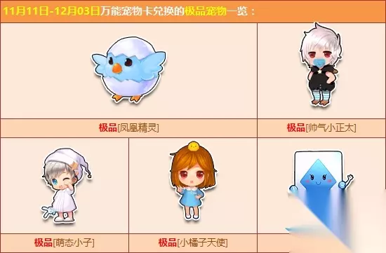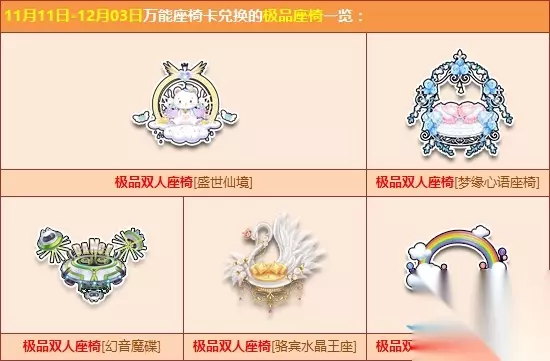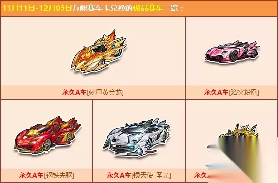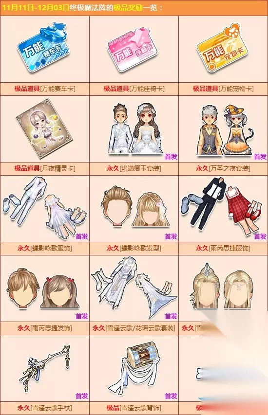 活动时间:2017年11月11日-12月3日 活动介绍: 双十一狂欢排队,终极魔法阵第二期奖励更新上线。活动期间,使用终极召唤卡召唤极品道具,即有机会赢取极品道具【万能赛车卡】/【万能座椅卡】/【万能宠物卡】。 使用对应的万能卡片,即可在兑换商店中兑换永久A车【刺甲黄金龙】/【浴火粉凰】/【钢铁先驱】、极品双人座椅【盛世仙境】/【梦缘心语座椅】/【幻音魔碟】、极品宠物【凤凰精灵】/【帅气小正太】等稀有奖励。 活动内容: