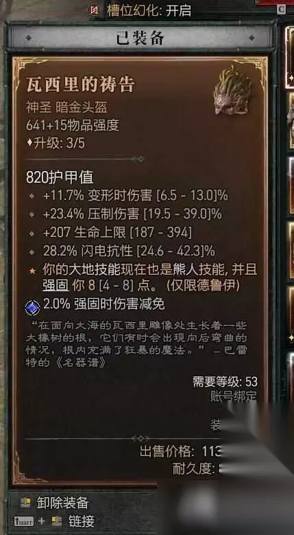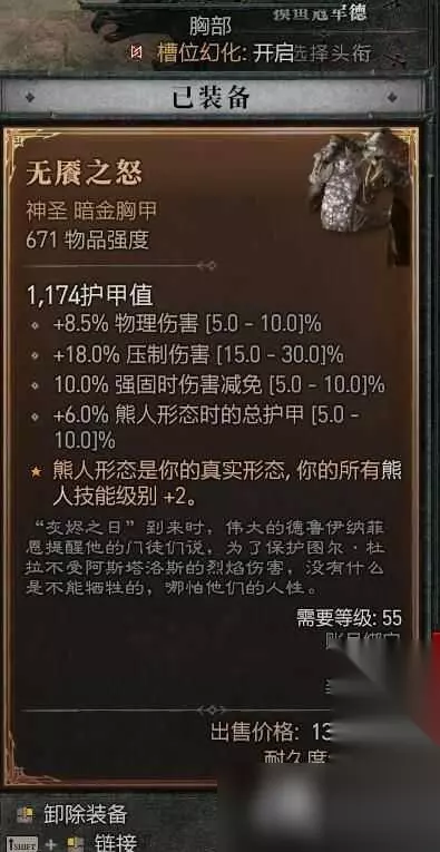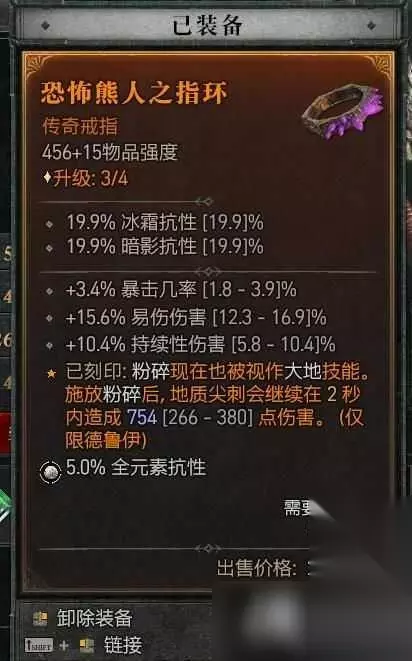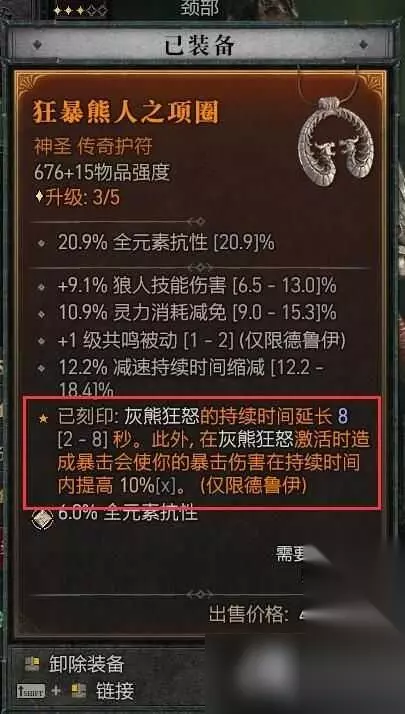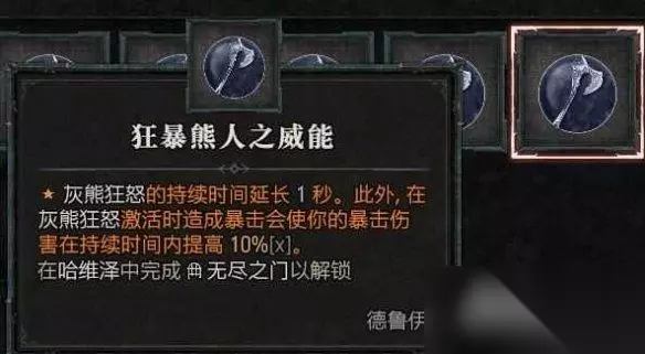 装备词缀 装备词条尽量选择:压制增伤,暴击伤害,大地技能暴击伤害,受控增伤,暴击几率,幸运一击几率。大地技能,熊人技能等级等等。 在头部,如果能拿到专属熊人暗金头,可以极大的缓解我们在变身时的生存压力,因为变身后可以开大地壁垒。