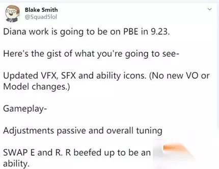皎月女神戴安娜一直以来在职业赛场上的存在感都非常低,大部分时间只能坐在冷板凳上。 路人局的皎月出场率也并不高,但这个英雄一旦发育成型,又有着非常恐怖的刺杀能力。整体来说并不均衡。为了挽救她的人气,同时对她的玩法进行平衡,拳头决定对其进行小规模重做,近日设计师公布了即将上线测试服的重做方案。 推文大意: 更新了视觉效果和特殊效果及技能图标,没有语音包更新和模型变化。 调整被动,及技能协调整合。 以及ER技能的互换。新的R技能会加强成为终极技能。