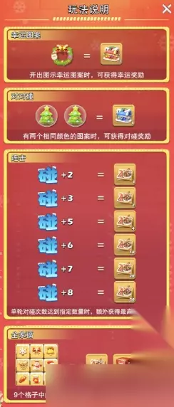 1.[幸运图案]:开出【圣诞花环】幸运图案时,可获得冰雪对碰幸运宝箱。 2.[对对碰]:两个相同图案可获得冰雪对碰宝箱。 3.[连击]:单轮对碰次数达到一定数量,额外拿冰雪兑换券奖励,次数越多券越多! 4.[全家福]:9个格子中的图案各不相同时,可获得豪华奖励!(冰雪兑换券*100、3级稀有技能自选箱*1、橙色万能碎片*2)。