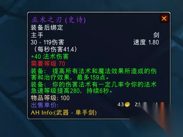 “巫术之刃”是专业法师的必备武器 “巫术之刃”是没有白字属性,也就是没有耐力和智力这种三围属性,只有两项绿字属性,第一项是加159点的法术伤害,和“大法师之剑”和“风暴召唤者”这两把武器的法伤一样。第二项绿字属性就是这把武器的精髓,法术伤害有一定的几率提高法术急速等级280点,持续6秒的时间,有效地减少了法术的施法时间,大大的提升了伤害。