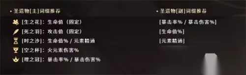 时之沙:百分比防御力>元素精通 副词条:元素精通>暴击率/暴击伤害 空之杯:火元素伤害 副词条:暴击率/暴击伤害>百分比防御力