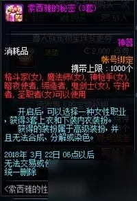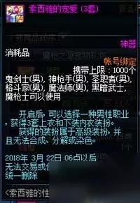 商城上架内衣装扮,分为女性款(索西雅的秘密)和男性款(索西雅的宠爱)2种。 女性款1套售价为1888点券,3套售价为3888点券。 男性款1套售价为2888点券,3套售价为5888点券。 以上两种款式两种内衣礼盒均限购1次,无法使用代币券,只能使用点券购买。