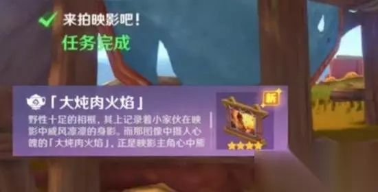 三、任务完成 完成上述步骤后,返回与阿卡坦加对话。对话结束后,“来拍映影吧”任务就算完成了。作为奖励,可以获得一定数量的原石以及相框【大炖肉火焰】,还有可能得到一张龙伙伴的照片作为额外奖励。