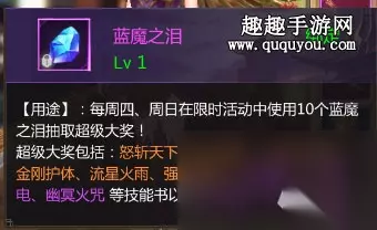 超级大奖包括:怒斩天下、天怒惊雷、火毒攻心剑、金刚护体、流星火雨、强化骷髅术、破盾斩、狂龙紫电、幽冥火咒等技能书以及命运(四阶-10阶) 想要获得蓝魔之泪,只需要大家前往宝地打宝就行了,击杀精英怪和稀有怪都有机会获得蓝魔之泪,并且还能得到大量的优质装备哦。