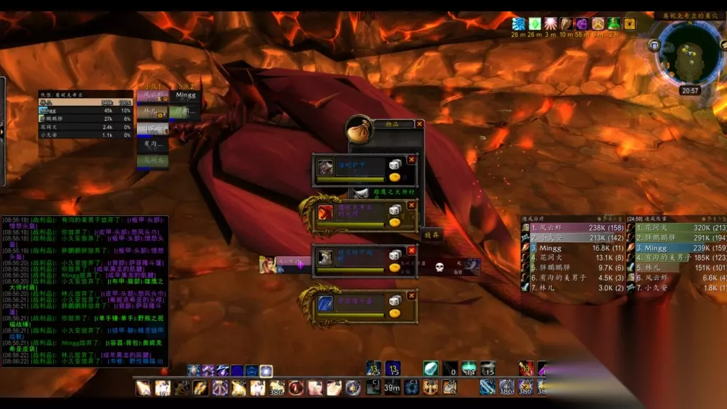 Loot:怒风头盔(分解)、愤怒头盔(分解)、萨菲隆斗篷、成年黑龙的肌腱、奥妮克希亚皮包。 二、团队配置 全程治疗&DPS数据