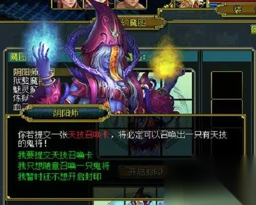 当你挑战成功后便会获得一张鬼宠残片,残片一共九张,每次挑战结束以后,都会随机获得九张中的一张。其余挑战的玩家也将每人获得一张鬼宠残片。当我们将九张残片收集完毕以后就可以在神幻魔图界面中点击开启封印了,系统会要求你选择你所要获得的阴阳师的类型,即体,力,敏,灵。玩家们收集完毕后可根据自己所需要的类型来开启封印。可以从商城购买一张天技召唤卡,就可以召唤出带有天技的鬼将了!