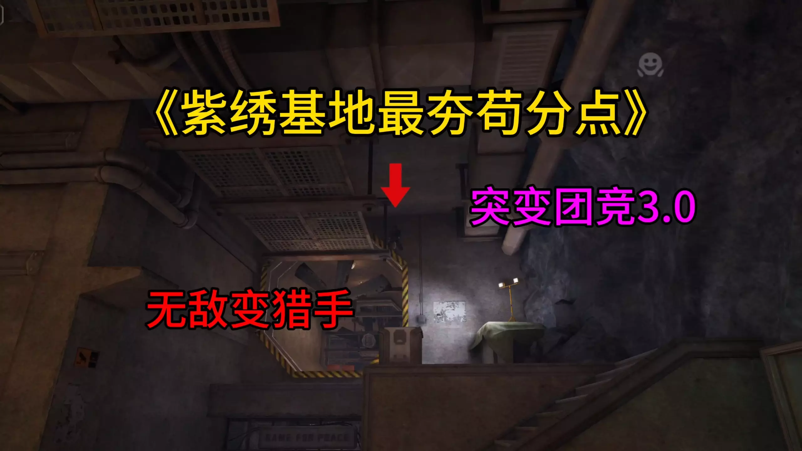 这是《和平精英》突变团竞3.0的游戏技巧帖,分享了紫绣基地的天花板苟分点,展示了具体的攀爬操作步骤,在这个点位突变者难以抓到玩家,帮助玩家掌握苟分技巧。