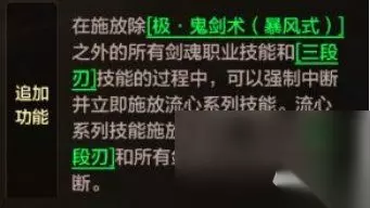 【25级】破极兵刃:施放后增加技能攻击力、物理暴击率(持续时间无限)。 【25级】流心:狂(被动):在施放除【极鬼剑术暴风式】之外的所有剑魂职业技能和基础技能【三段刃】的过程中,可以强制中断并立即施放流心系列技能。流心系列技能施放过程中,可以用【三段刃】和所有剑魂职业技能强制中断。 【25级】流心:斩:前置条件【流心:升】,发动一次拉斩+上挑的十字斩击,上挑会浮空敌人。