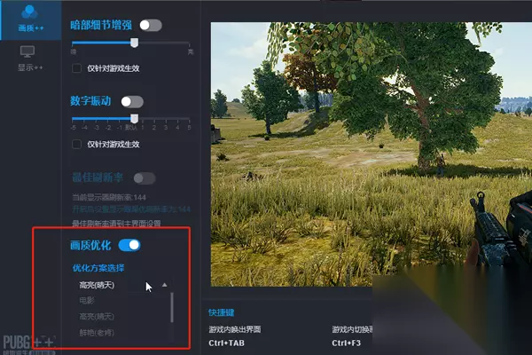 在绝地求生超级助手中调画面的具体步骤 1、运行超级助手,点击游戏加加,随后选择画质++,即可进入画质优化的配置界面。 2、点击勾选下方画面优化选项,我们可以对游戏的画面色彩进行优化,使游戏画面更清晰、鲜亮、真实,针对不同天气不同场景适配不同的画质优化方案,让玩家能够感受到更加真实游戏体验,能够更加清晰的看清远方的敌人提高吃鸡几率。 PS:画质优化虽然可以提供给用户更加出色的画面体验,但由于对游戏画面进行了二次渲染类似滤镜,所以开启画质优化选项可能导致游戏掉帧。
