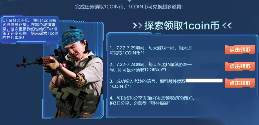 彩蛋福利,猜中即可5选1 请问M60-战神8这把武器,枪身上的花纹组成了什么字?(提示:游戏内第一视角看的更清楚哦! ) 答案:8 黑色城镇的神秘无线电,探索领神秘礼包 成功输入老沙的暗号,即可额外领取1COIN币*1。 暗号:齐聚CF8月6日火线盛典