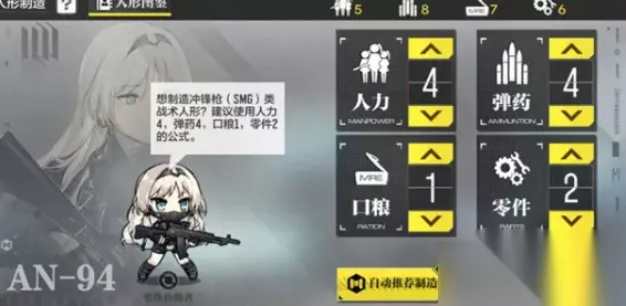 二、人形制造秘籍 1.使用系统推荐公式直接制造,方便快捷。 2.手动输入特定公式,制造特定类型的战术人形。 希拉的提示:可以注意一下协助者的气泡文字哦!听说会告诉你特殊的公式~ 总的来说,其实多打几把收集资源,然后自动推荐制造就可以了~